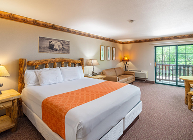 Our Accessible King Suite has a king-size bed and a queen sofa. Accessible features include a private bathroom with a roll-in shower, shower seat and roll-under sink. Additional room features are a table and two chairs, cable television, coffee maker, microwave, refrigerator, hair dryer and free Wi-Fi internet access.
